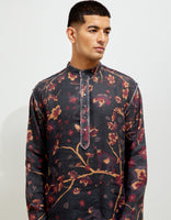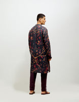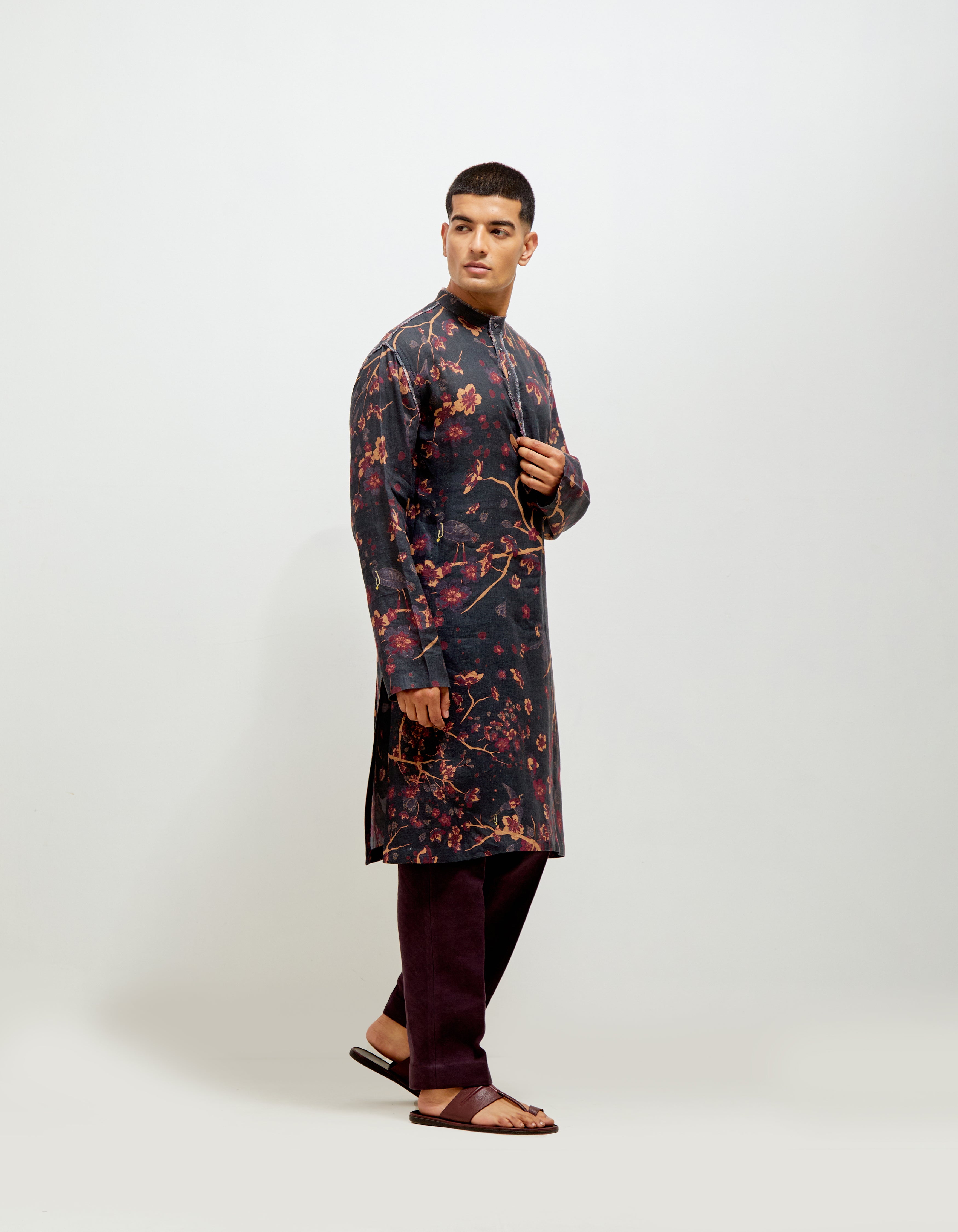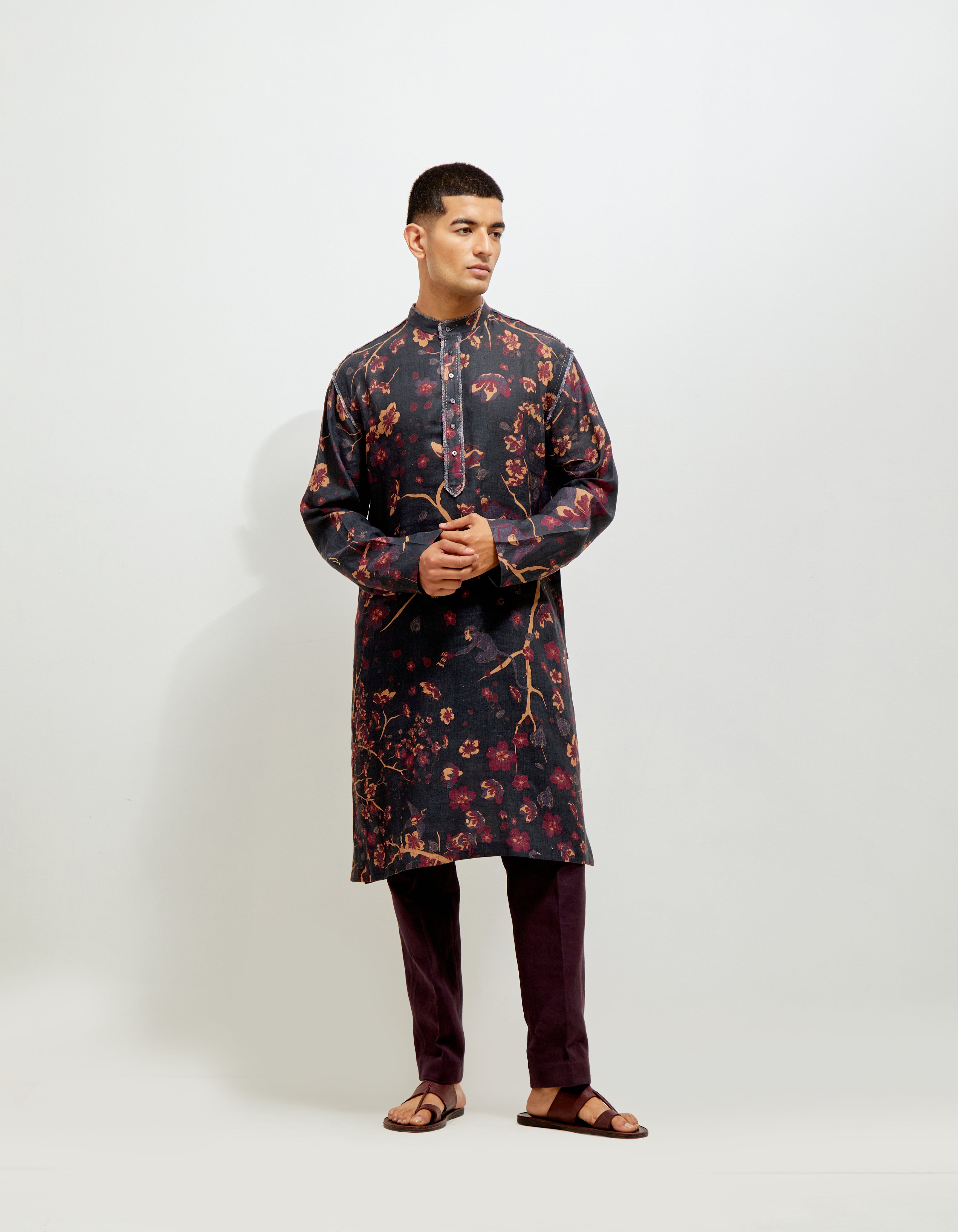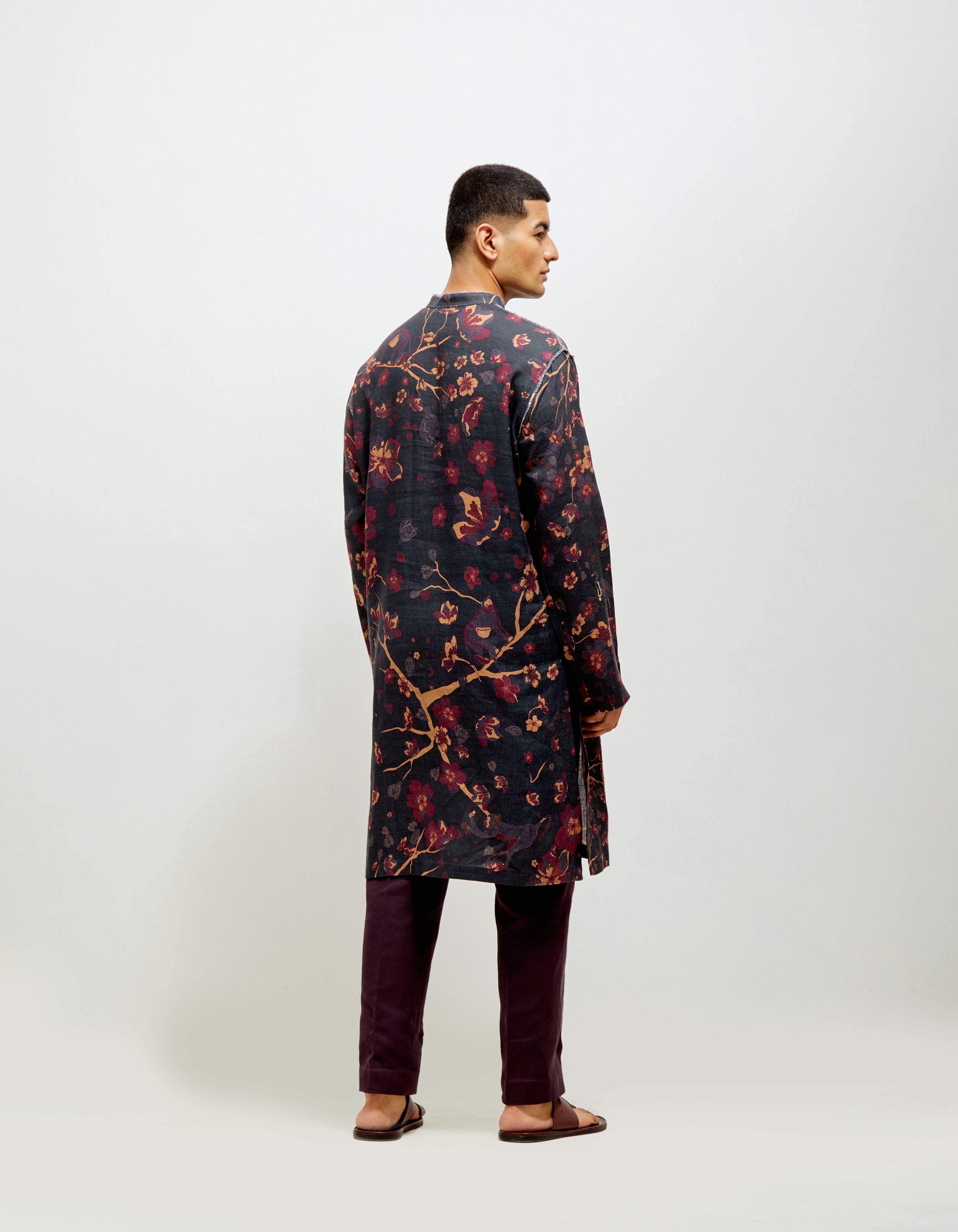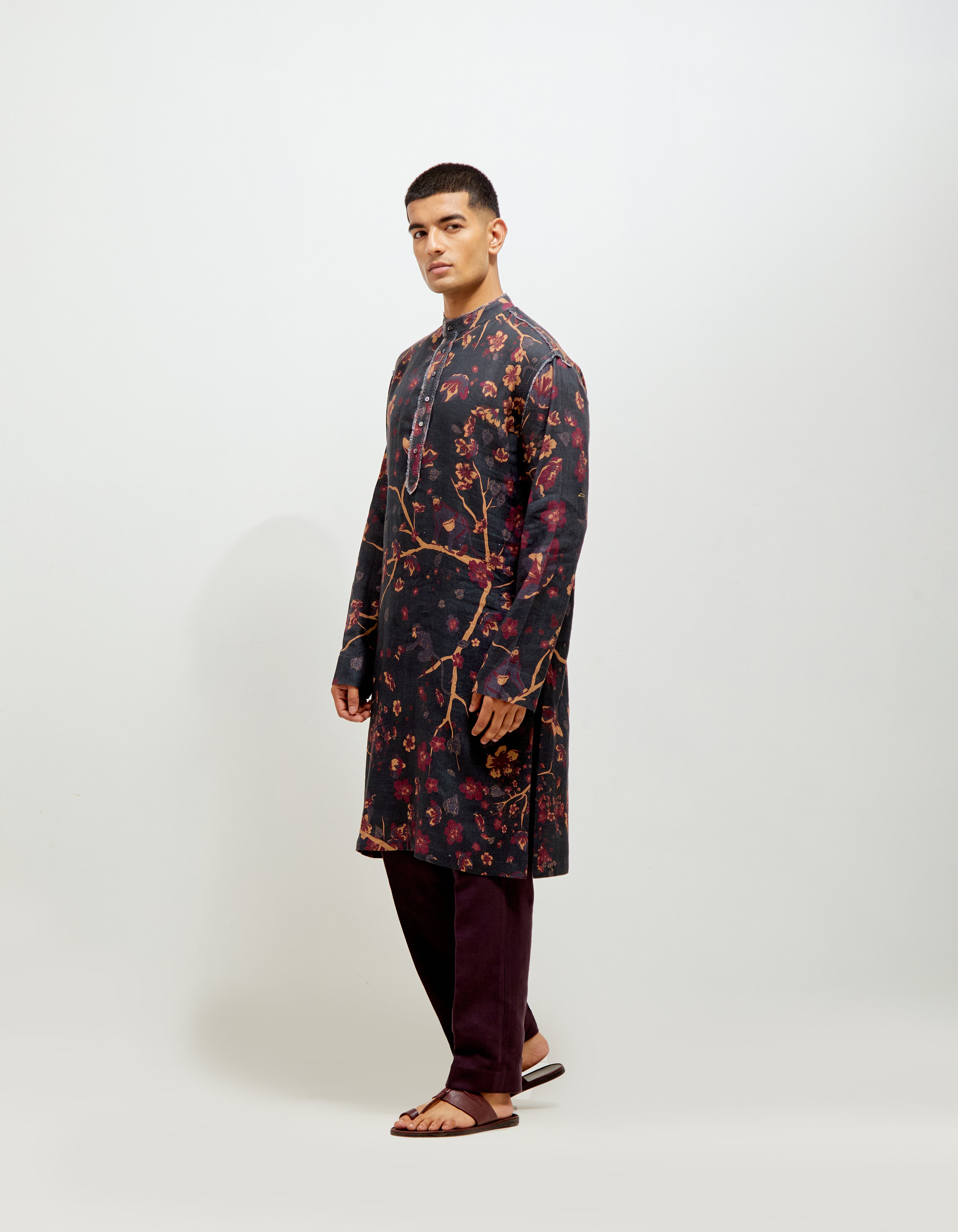 • SD Forest Blossom Raw Edge Bade Miyan Kurta D-Green Linen