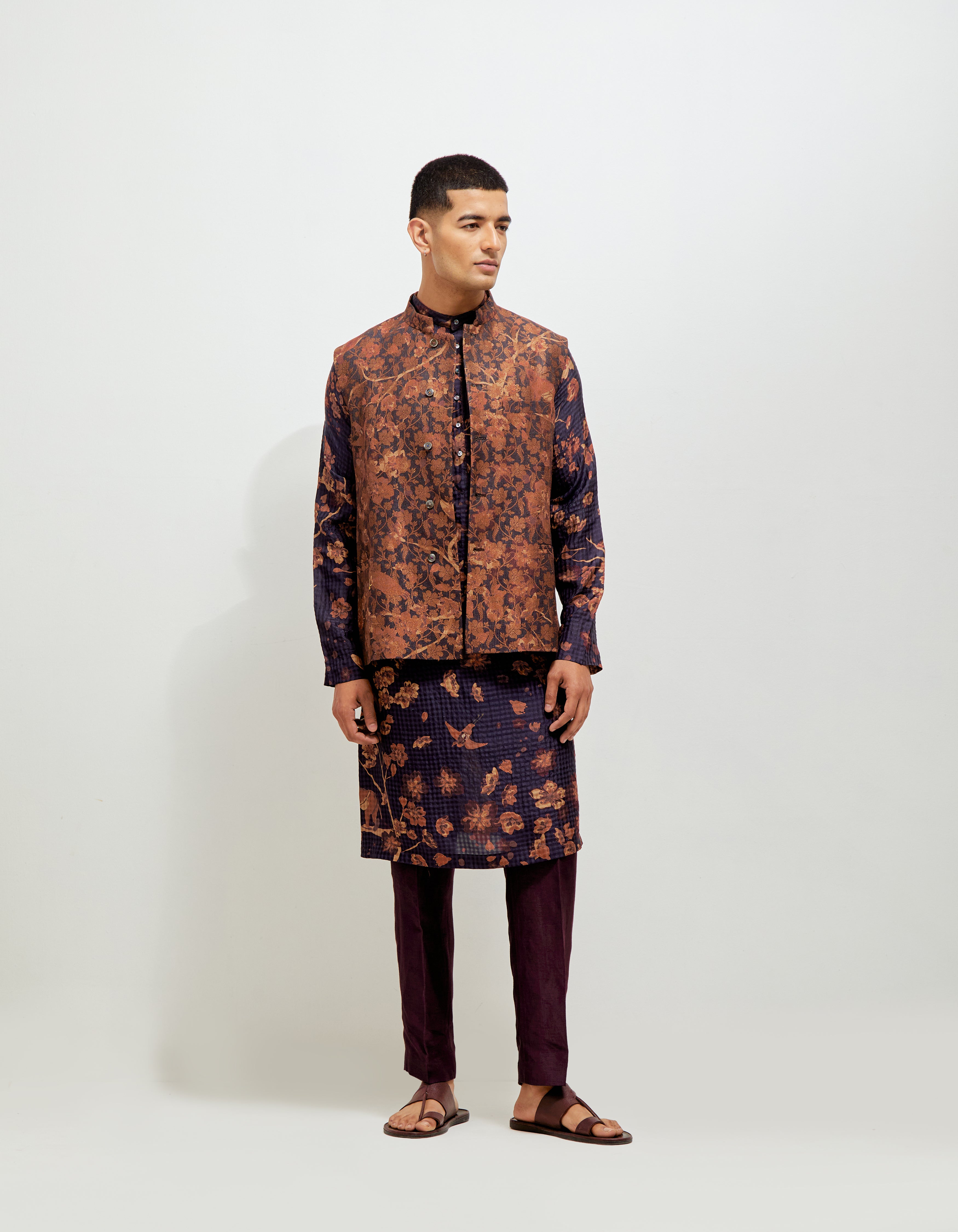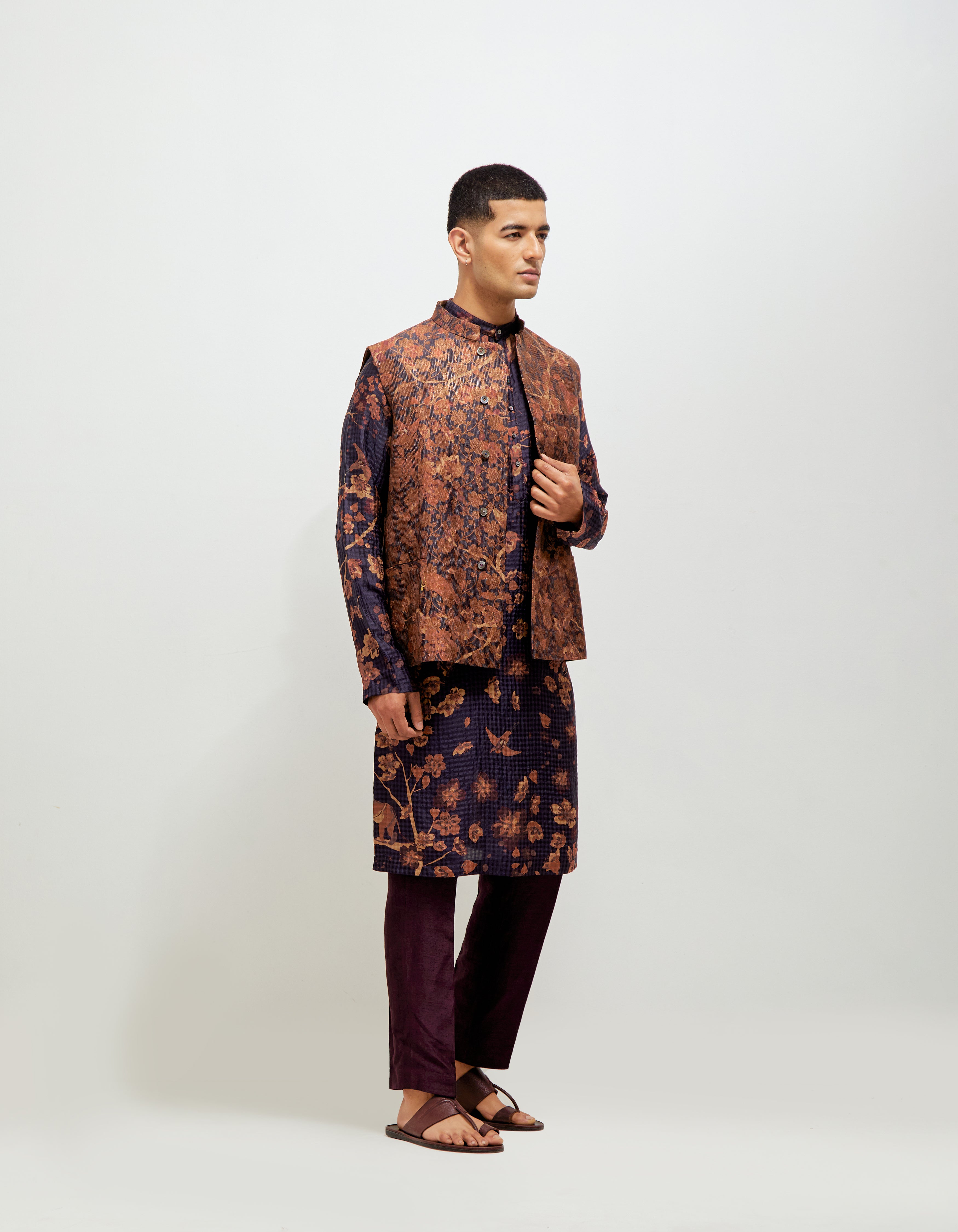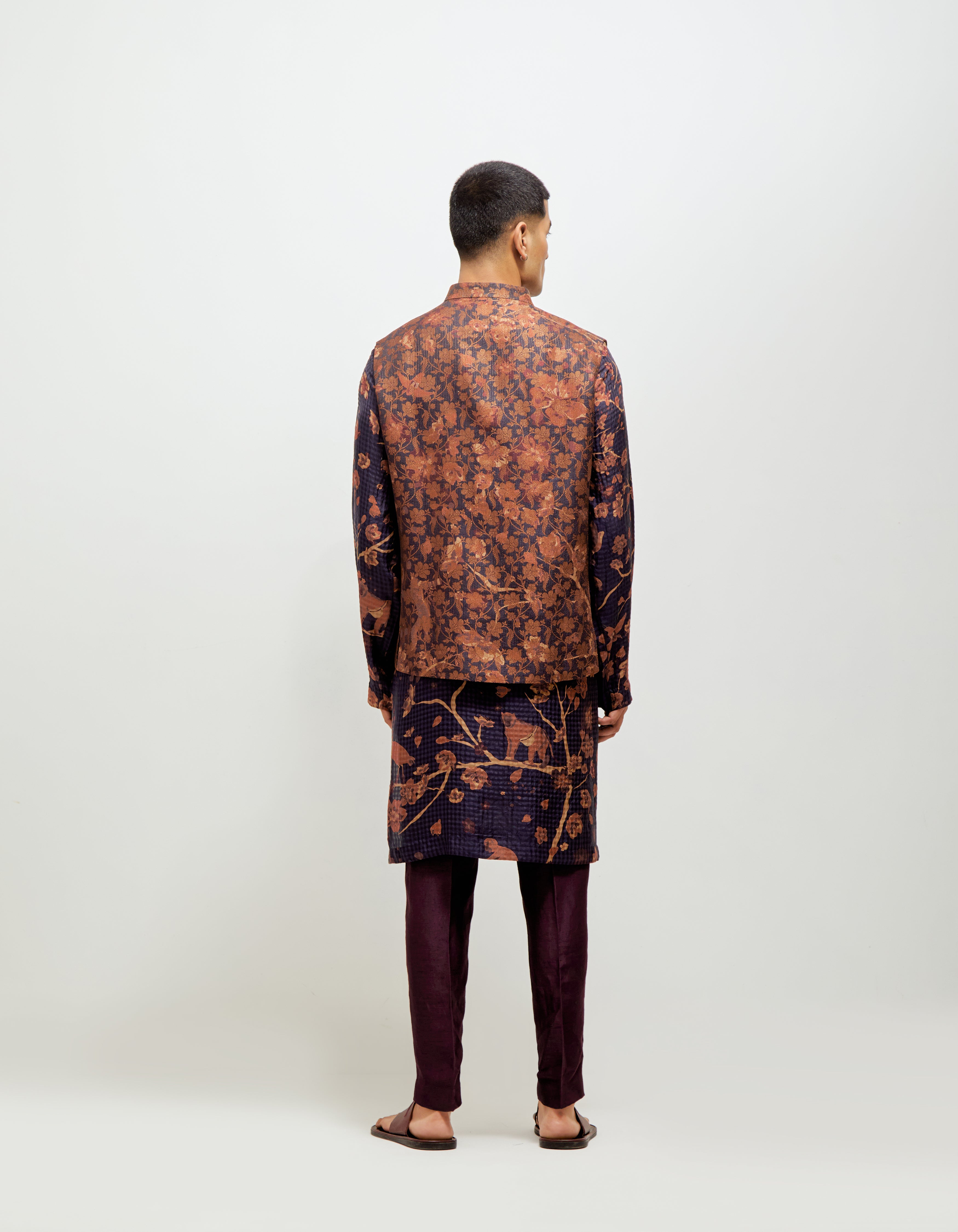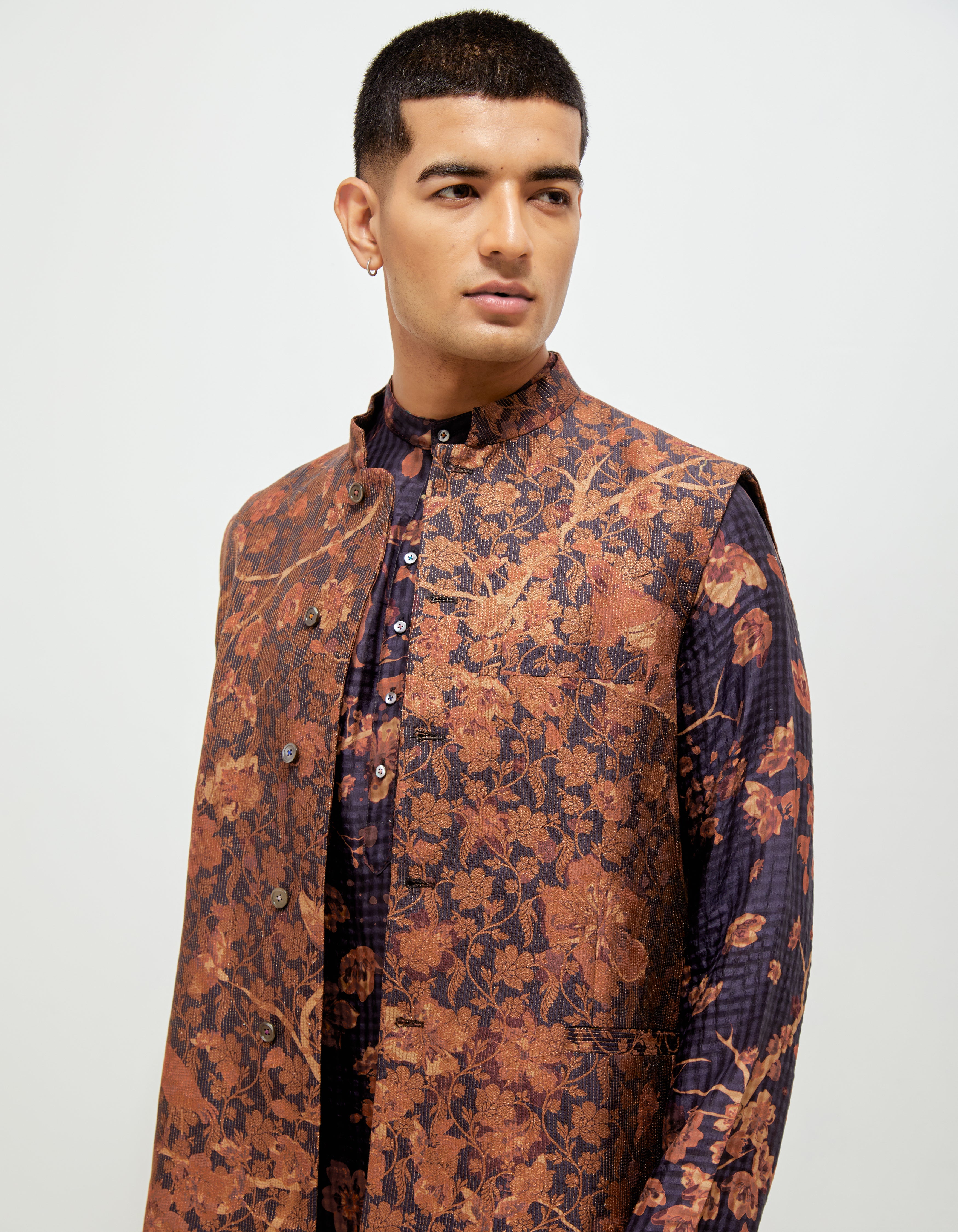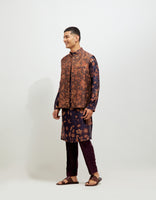 • SD Forest Blossom Roshan Shaan Gilet Orange Navy Silk Brocade