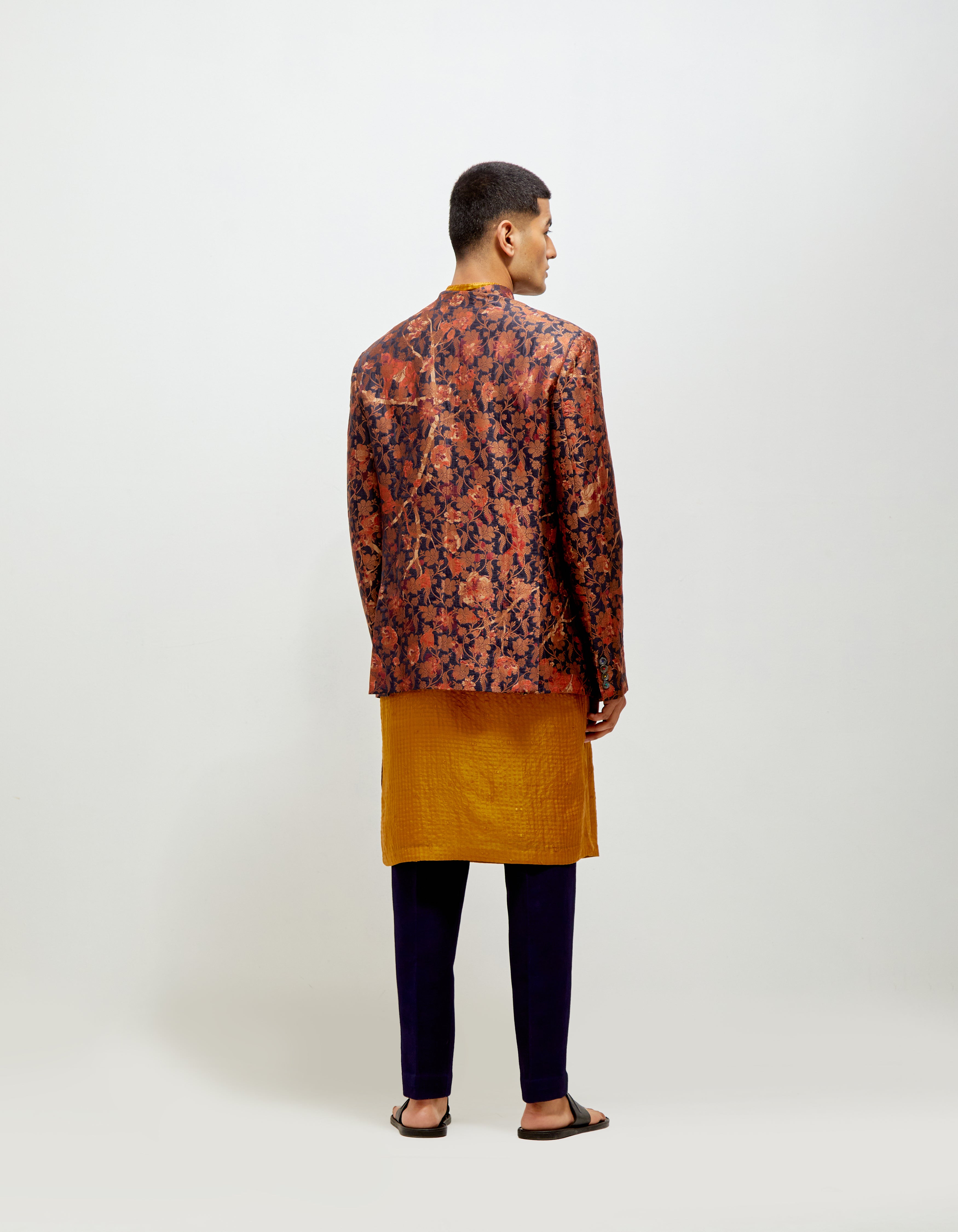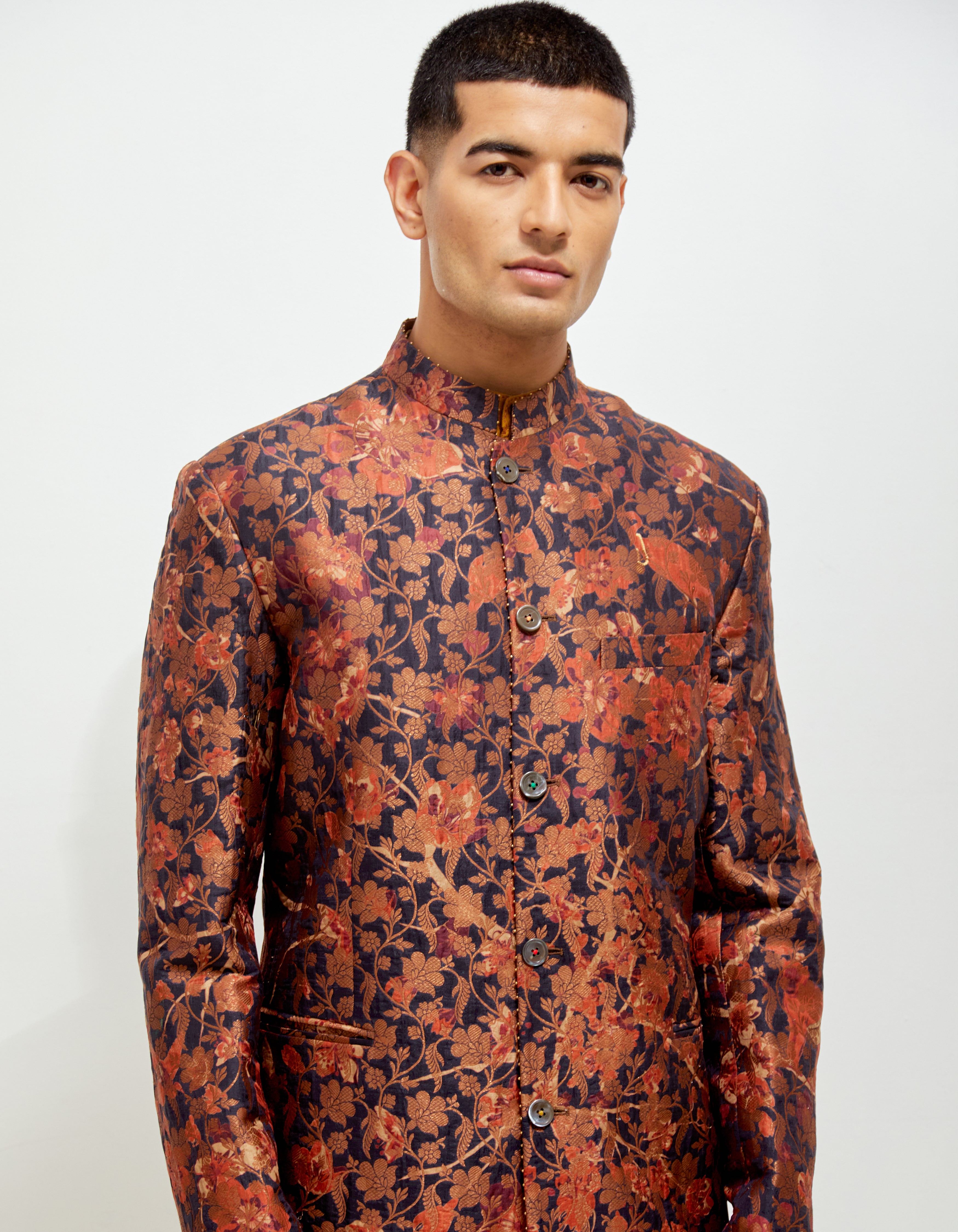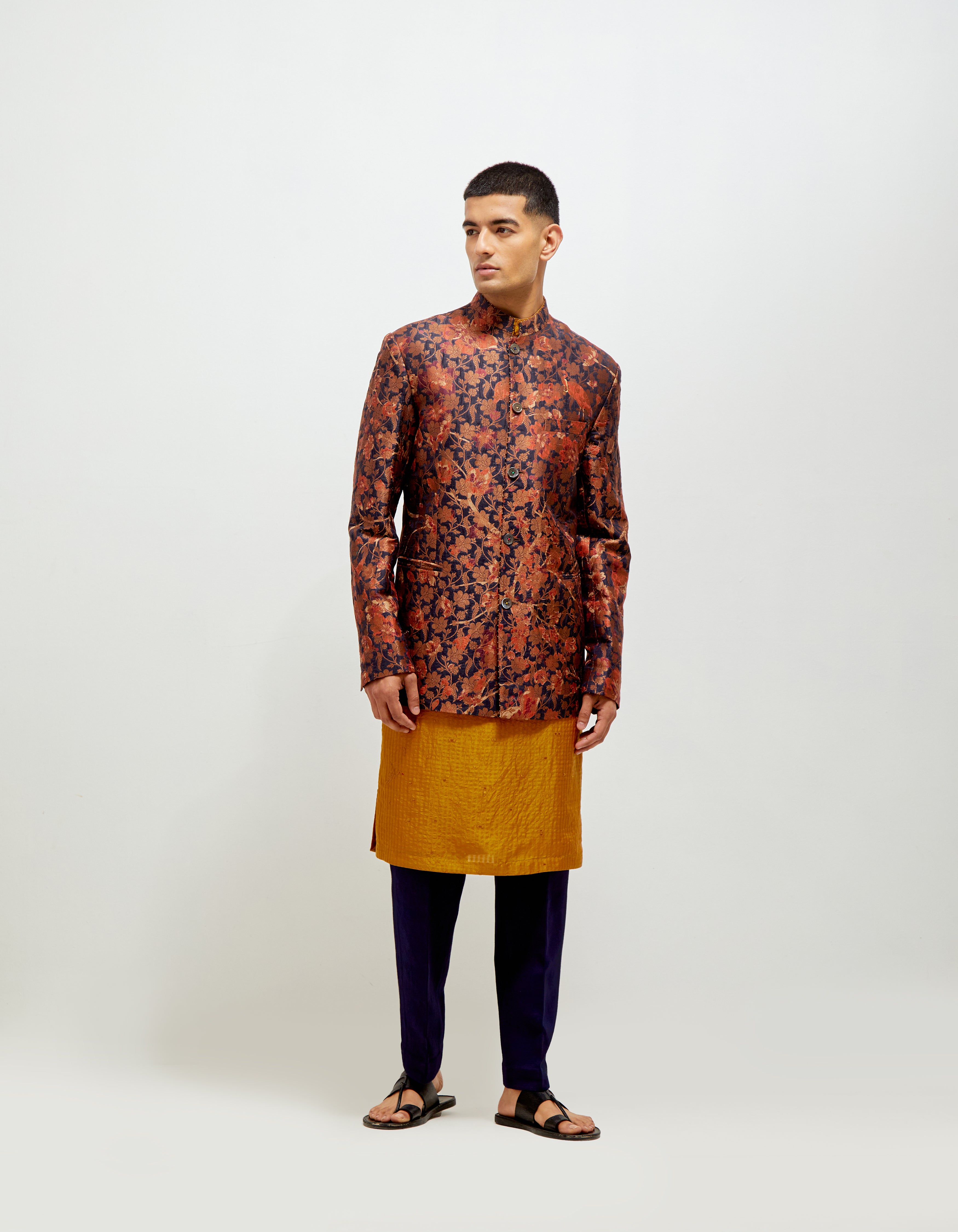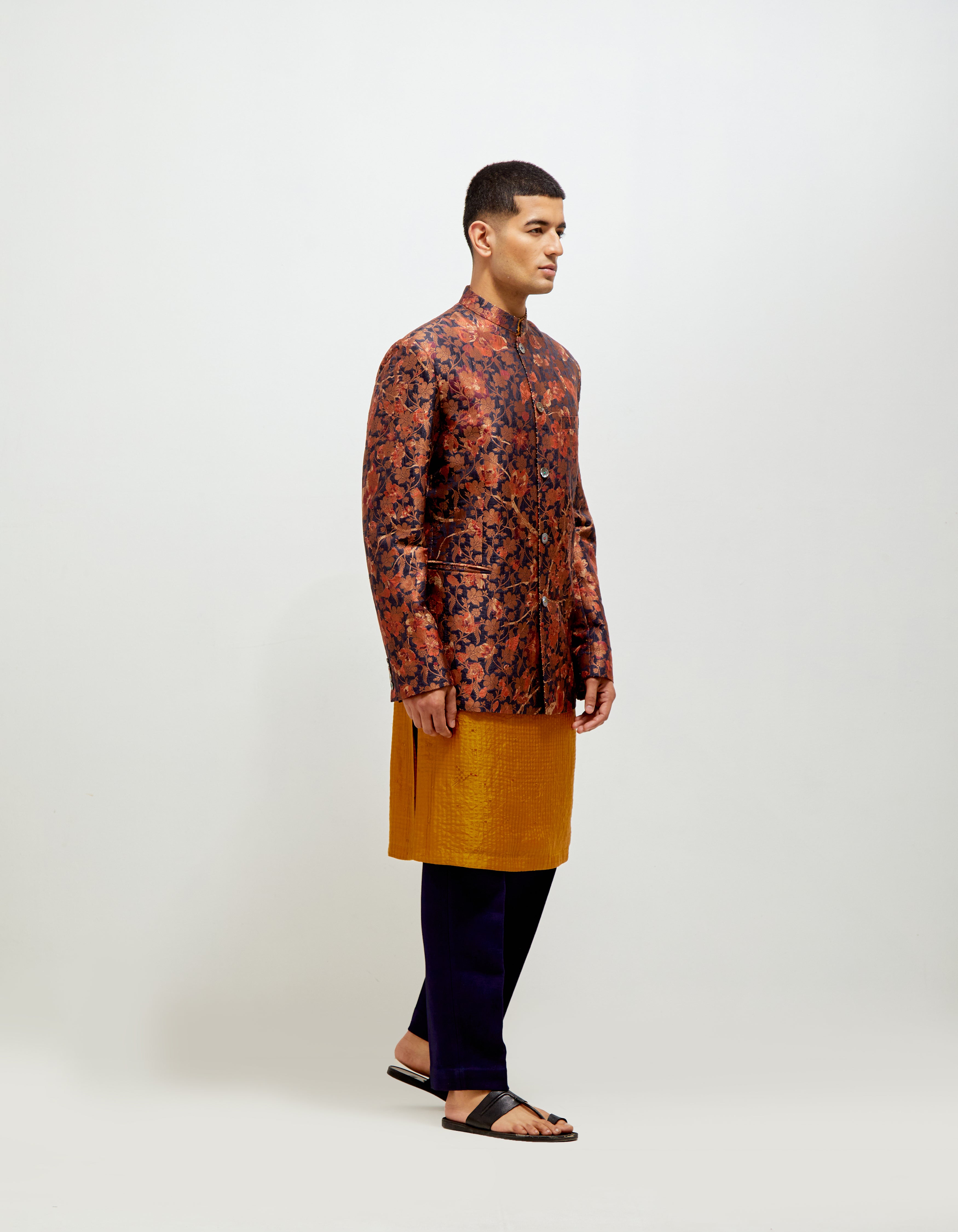 SD Forest Blossom Bandhgala Orange Navy Sik Brocade